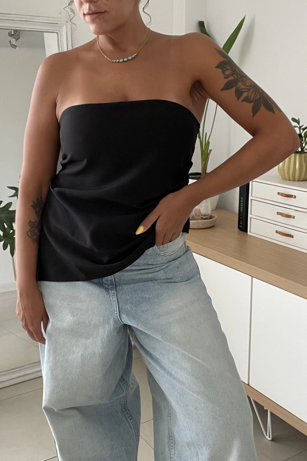 Strapless sastrero en pico, con cierre invisible de costado, tajo en el pico y frunces a los costados. Todo lo que necesitas para levantar ese denim que tanto amás.